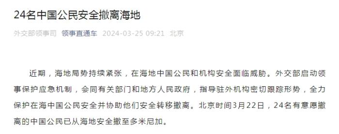 中新網(wǎng)3月25日電 據(jù)外交部領(lǐng)事司微信公眾號(hào)“領(lǐng)事直通車”25日消息,近期,海地局勢持續(xù)緊張,在海地中國公民和機(jī)構(gòu)安全面臨威脅。外交部啟動(dòng)領(lǐng)事保護(hù)應(yīng)急機(jī)制,會(huì)同有關(guān)部門和地方人民政府,指導(dǎo)駐外機(jī)構(gòu)密切跟蹤形勢,全力保護(hù)在海中國公民安全并協(xié)助他們安全轉(zhuǎn)移撤離。北京時(shí)間3月22日,24名有意愿撤離的中國公民已從海地安全撤至多米尼加。