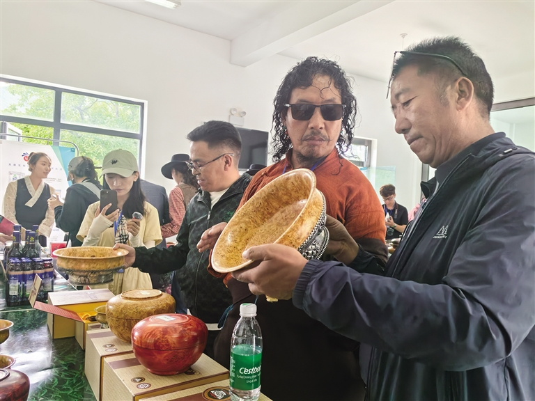 探訪團一行前往西藏山南加查達布傳統(tǒng)文化產(chǎn)業(yè)發(fā)展有限公司探訪加查木碗的制作技藝。在該公司的展廳內(nèi),西藏自治區(qū)級加查木碗非遺傳承人、公司負責人桑珠向探訪團詳細講解了加查木碗從選材、切割、打磨到雕刻的每一個制作環(huán)節(jié)。桑珠拿起一個個造型各異、原材料不同的木碗向探訪團介紹著木碗的品質分辨技巧、用處等。楊樹、松樹、柏樹……一塊塊承載著歲月的木頭,經(jīng)過木匠們的一道道復雜的工序后,變成了精美的藝術品?!斑@種碗面像圓珠筆點涂的是上等木料制成的精品,最低售賣價值可達到4000元一個?!鄙V檎f,“現(xiàn)在來買木碗的人越來越多,很多游客也會買回去當伴手禮。這讓我更加堅定了傳承和發(fā)展這項技藝的決心?!?/p>
