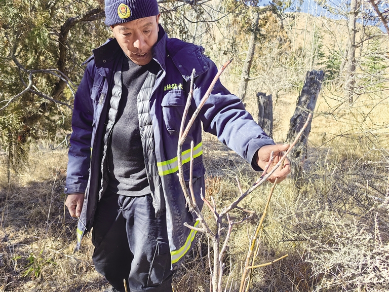 目前,南山公園的樹種特別多,有油松、竹子、桃樹、楊樹、杏樹等?!扒锾斓絹砗?,樹上有野山桃、山杏等果實,我有時會摘一些成熟的水果吃。”扎西曲培說,“南山公園就像自己的孩子,看著它一點點長大。時間越久,我對南山公園的感情越深。”