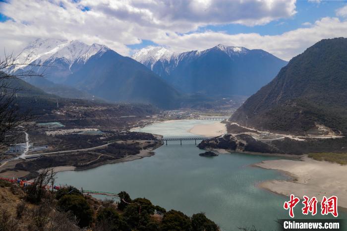 3月28日,西藏自治區(qū)林芝市,雅魯藏布江碧綠的江水與遠(yuǎn)處的雪山相映成趣,景色如畫。中新社記者 馬銘言 攝