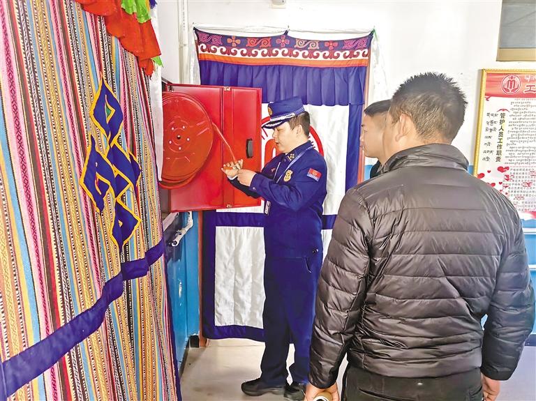 林芝市墨脫縣消防救援大隊(duì)宣傳人員檢查養(yǎng)老機(jī)構(gòu)微型消防站的消防器材。通訊員 才旺多吉 攝