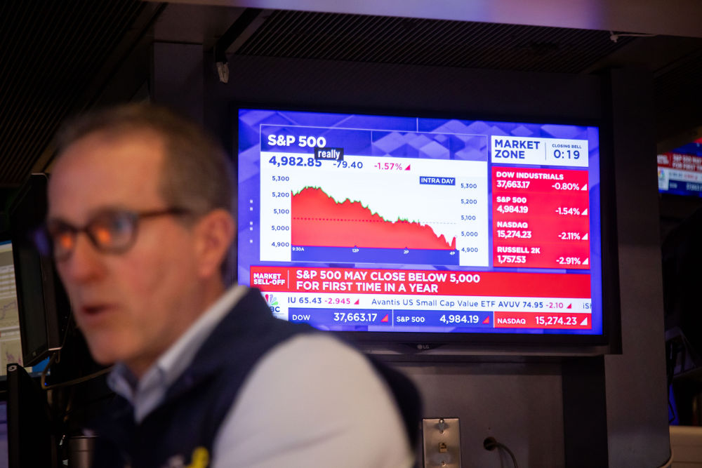 4月8日,交易員在美國(guó)紐約證券交易所交易大廳工作。紐約股市三大股指當(dāng)天下跌。新華社發(fā)(郭克攝)