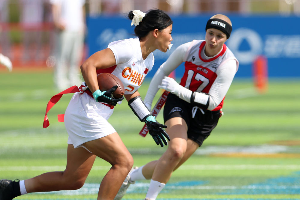 8月14日,在2025年成都世運會腰旗橄欖球女子預賽A組比賽中,中國隊45:47不敵奧地利隊。圖為中國隊球員高子旋(左)在比賽中。新華社記者 陳斌 攝