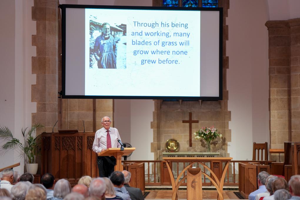 7月22日晚,英國赫特福德郡哈彭登鎮(zhèn),何克逝世80周年紀念活動現(xiàn)場,座無虛席。屏幕上,一幀幀畫面定格下何克在中國的身影與足跡。講臺上,何克的外甥馬克·艾爾溫·托馬斯深情講述80多年前的往事。