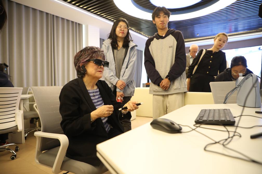 4月15日,在培黎職業(yè)學院,英中了解協(xié)會榮譽主席佐伊·里德體驗學生們親手設(shè)計搭建的虛擬現(xiàn)實場景模型。新華社記者 張智敏 攝