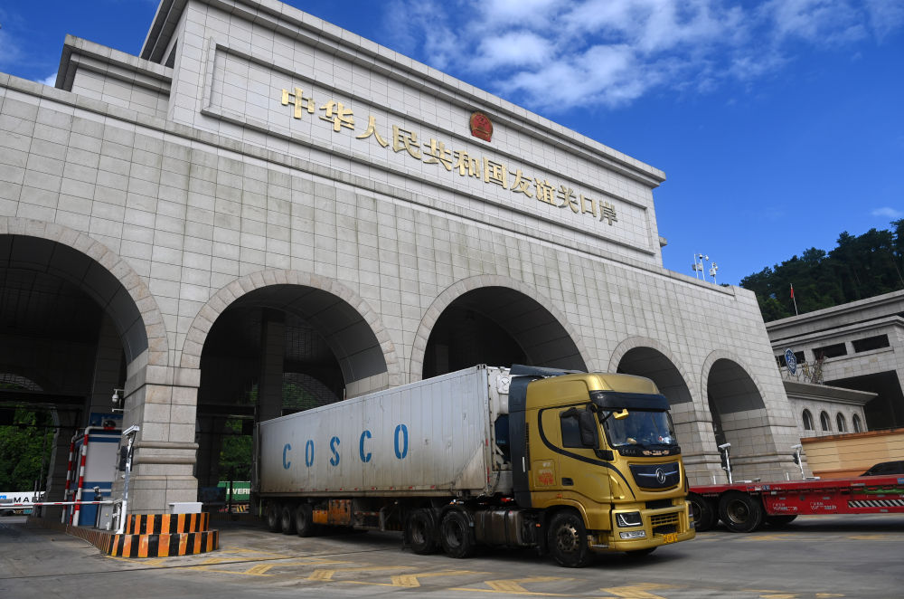 2024年8月26日,一輛貨車通過(guò)廣西憑祥友誼關(guān)口岸。友誼關(guān)口岸是西部陸海新通道的重要節(jié)點(diǎn),是中國(guó)通往東盟最大的陸路口岸,也是我國(guó)通往越南最便捷的陸路大通道之一。滿載著東盟國(guó)家特色水果、農(nóng)副產(chǎn)品與中國(guó)電子配件、大型設(shè)備等貨品的車輛在此“雙向奔赴”、川流不息。2024年,友誼關(guān)口岸年內(nèi)出入境貨車數(shù)量首次突破50萬(wàn)輛次,同比增長(zhǎng)15.96%,創(chuàng)歷史新高。