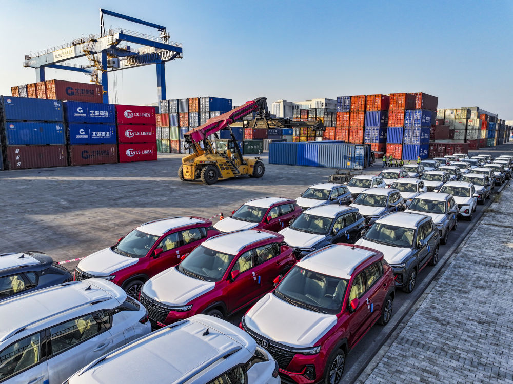 2024年10月28日在重慶國(guó)際物流樞紐園區(qū)西部陸海新通道重慶無(wú)水港拍攝的出口汽車裝運(yùn)現(xiàn)場(chǎng)(無(wú)人機(jī)照片)。位于重慶市沙坪壩區(qū)的重慶國(guó)際物流樞紐園區(qū),是重慶中歐班列、西部陸海新通道班列、渝滿俄班列、渝甬班列的主要到發(fā)點(diǎn),截至2024年10月,已開(kāi)通班列線路62條,輻射125個(gè)國(guó)家和地區(qū)的542個(gè)港口。