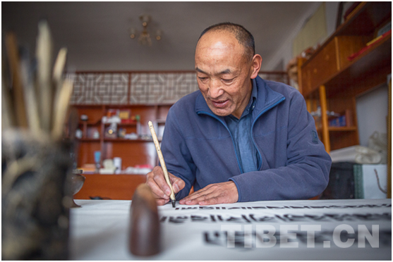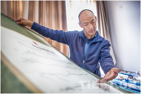 每項工作的出色完成,靠的不僅僅是久米次成嚴謹的工作態(tài)度,還依賴于他深厚的文化功底。畢業(yè)于北京中國藏語系高級佛學院的他,精通藏梵文,酷愛書法。作為西藏書法家協(xié)會副主席的久米次成,其藏梵文書法在各地市珍藏達數百幅,先后榮獲全國和西藏的多種獎項。為了更好地傳承和弘揚藏文化,久米次成開始免費義務收徒教授藏文書法,到目前為止,已經有600多名學生,遍布西藏各地,有的學生已經成長為老師,開始了自己的藏文化傳承之路。