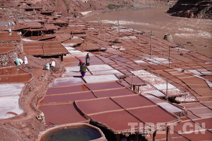 村民從梯子向下深入到洞底幾米至十幾米的深處,將鹵水背上來倒在鹽田里,經(jīng)過強烈的日光照射,水份逐步蒸發(fā)完后就是鹽粒,曬干運入市場進行商品交易。每塊鹽田產(chǎn)鹽約十幾斤,三至五天掃一次,天氣不好的時候二十天左右掃一次,桃花盛開的季節(jié),也就是農(nóng)歷二、三月份時的鹽產(chǎn)量最高、質(zhì)量最好,價格也比平常高。年產(chǎn)鹽量約300萬斤,收入100 萬至130萬左右。鹽的銷路比較廣,除銷往西藏昌都的貢覺縣、察雅縣、左貢縣、八宿縣、芒康縣、林芝的察隅縣外,還銷往四川的巴塘縣、理塘縣、康定縣,云南的德欽縣、香格里拉縣、維西縣等地。