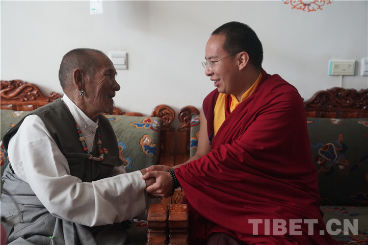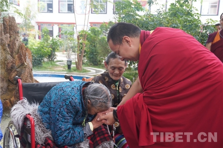 十一世班禪在參加各項(xiàng)活動(dòng)期間,專程看望阿里地區(qū)“雙集中”供(收)養(yǎng)服務(wù)中心的老人和孩子們,并為每一位老人摸頂賜福,噓寒問暖,給老人和孩子們帶去了親人般的關(guān)懷。一位老阿媽(嬤啦)當(dāng)場(chǎng)緊緊拉著十一世班禪的手放在自己的額頭,感動(dòng)流淚,嘴里不停地說“突吉其,突吉其”(謝謝!謝謝?。J皇腊喽U和老人們圍坐在一起飽含深情地說:“在黨中央的關(guān)心關(guān)懷下,老人家弱有所扶、老有所養(yǎng)、病有所醫(yī)、住有所居,這充分體現(xiàn)了社會(huì)主義制度的無(wú)比優(yōu)越性,看到你們健康幸福的生活我很欣慰,我會(huì)為你們祈禱,我會(huì)再來(lái)看望你們?!背錆M溫情的一幕使在場(chǎng)人員無(wú)不動(dòng)容。
