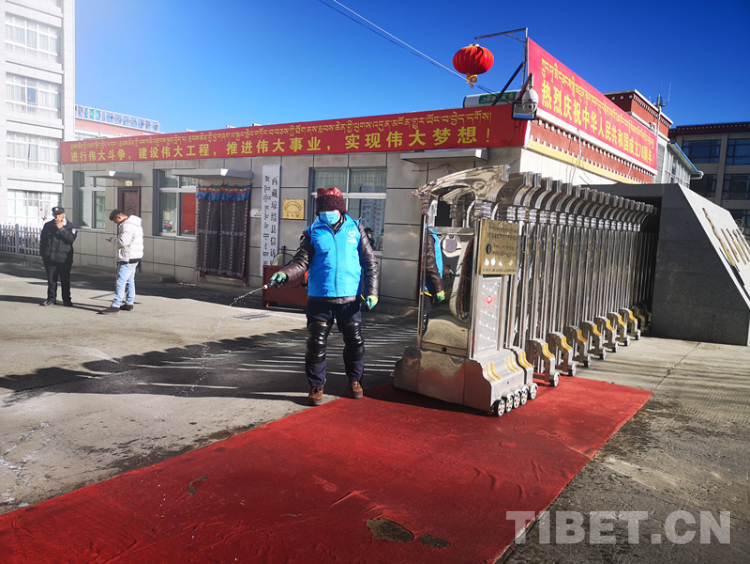 圖為瓊結(jié)縣志愿者洛桑頓珠正在為政府大院消毒。