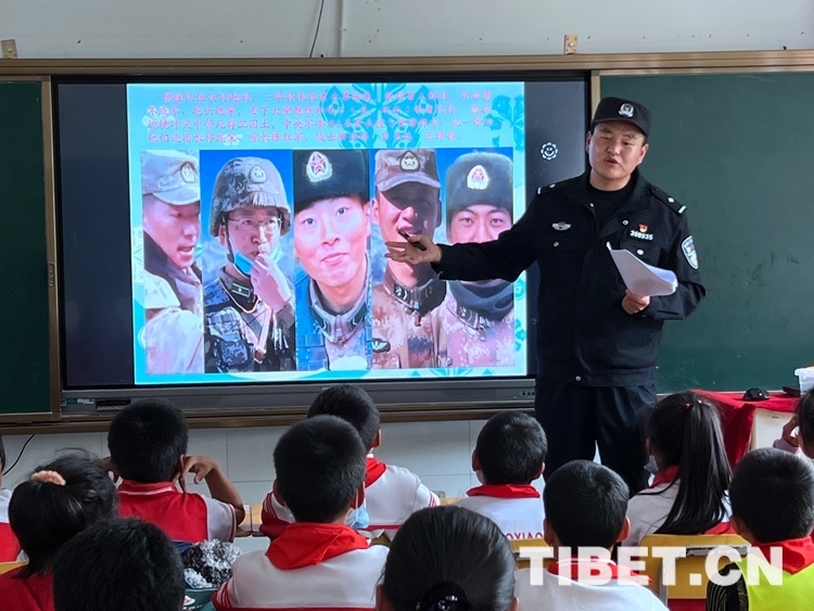 中國西藏網(wǎng)訊 “同學(xué)們,大家知道照片上這位英雄是誰嗎?”伴隨著民警周升展的提問聲,孩子們紛紛舉起手回答出了這位英雄——祁團長。“你們真聰明,今天叔叔給大家講一講新時代衛(wèi)國戍邊英雄祁發(fā)寶團長的故事……”