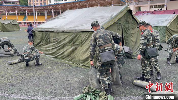 記者10日從四川省阿壩州委宣傳部獲悉,6月10日凌晨,四川阿壩州馬爾康市多次地震發(fā)生后,武警四川總隊(duì)阿壩支隊(duì)第一時(shí)間趕到震區(qū)周邊居民密集區(qū)域,擔(dān)負(fù)搭建安置點(diǎn)、安撫群眾、巡邏執(zhí)勤等任務(wù)。今天清晨五點(diǎn),災(zāi)區(qū)又出現(xiàn)降雨天氣,武警官兵們在馬爾康市城區(qū)應(yīng)急避難場所,緊急搭建帳篷。