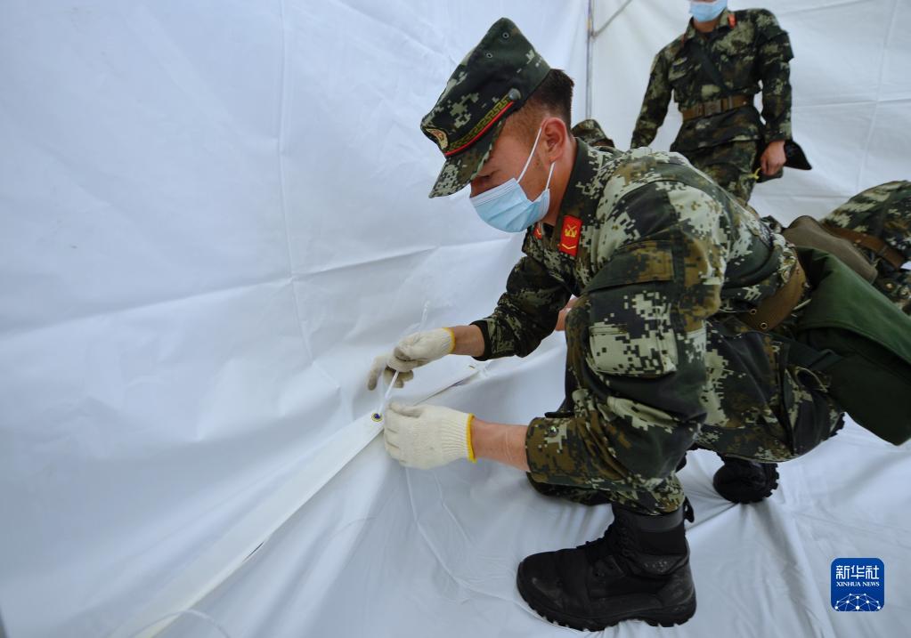 6月10日,在馬爾康市州醫(yī)院背后廣場安置點內,武警阿壩支隊隊員在搭建帳篷。新華社記者 劉坤 攝