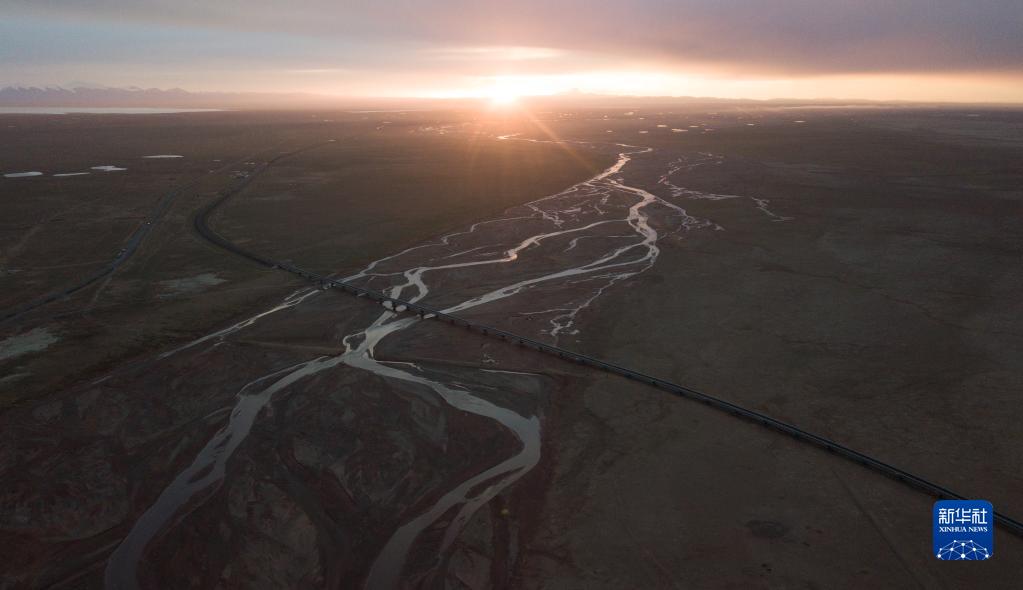 6月15日,一列火車駛過(guò)長(zhǎng)江源地區(qū)的沱沱河。新華社記者 張鋮 攝