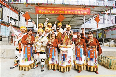 阿壩林卡社區(qū)居委會老年文藝隊在表演節(jié)目后,集體合影留念并向全區(qū)人民拜年。
