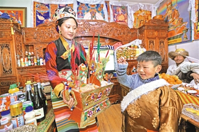 大年初一,各族群眾穿上漂亮的新衣,互致新春的問候。在每個家庭中,奶渣、風干牛肉、人參果飯、各色糖果、飲料、啤酒、青稞酒等擺滿了客廳的桌子,長者們手捧吉祥的切瑪盒,端著青稞酒給家里的親朋好友送上誠摯的祝福。吉祥的切瑪盒里裝著青稞、糌粑等,插上五彩麥穗和羅薩美朵,象征著來年風調雨順、五谷豐登、吉祥如意。