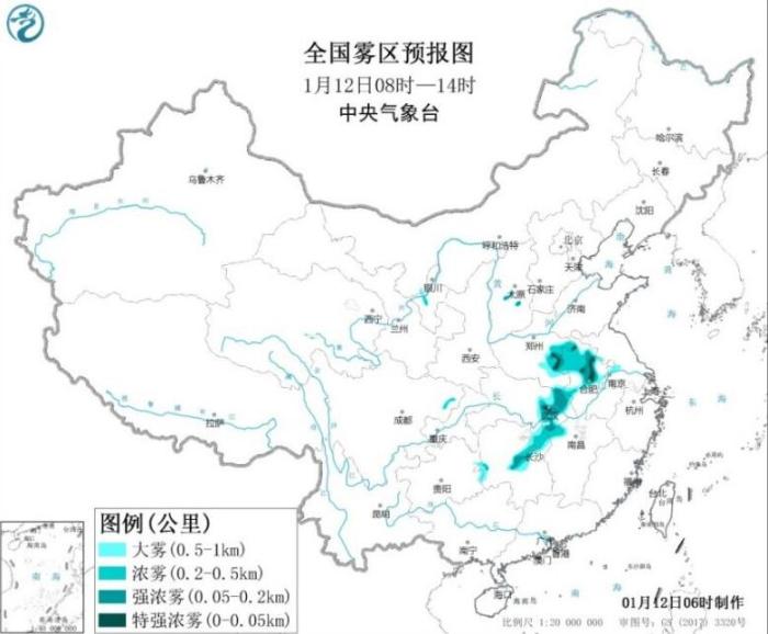 另外,12日早晨至上午,河南東南部、安徽中北部、湖北東南部、湖南東部等地等地有大霧,其中,安徽北部、湖北東南部、湖南東部等地的部分地區(qū)有能見度不足200米的強(qiáng)濃霧,局地有能見度不足50米的特強(qiáng)濃霧。中央氣象臺于12日06時(shí)發(fā)布大霧黃色預(yù)警(見圖1)。