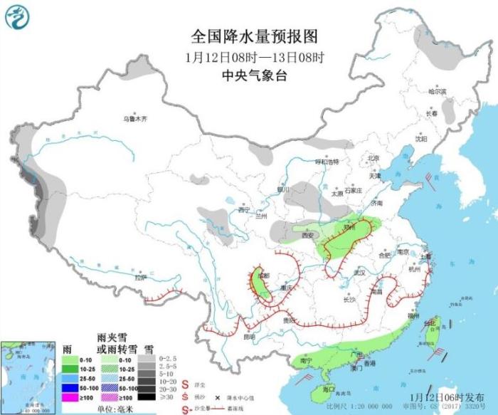 1月12日08時(shí)至13日08時(shí),內(nèi)蒙古中西部、黑龍江中北部、吉林東部、南疆盆地好西部山區(qū)、青海東南部、西北地區(qū)東部、華北南部、河南西部等地部分地區(qū)有小雪或雨夾雪,其中,南疆盆地和西部山區(qū)、西藏西部等地部分地區(qū)有中到大雪。河南大部、湖北北部和西部、四川盆地西南部、福建東南部、廣西南部和東南部沿海、廣東大部、海南島、臺灣島等地部分地區(qū)有小雨(見圖2)。