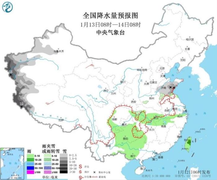 1月13日08時(shí)至14日08時(shí),新疆西南部和伊犁河谷、西藏西部、黃淮東部等地部分地區(qū)有小到中雪或雨夾雪,其中,南疆西部山區(qū)、西藏西部、山東東南部等地部分地區(qū)有大雪,南疆西部山區(qū)和西藏西部等地局地暴雪(10~19毫米)。江漢東部、江南北部、西南地區(qū)東南部、廣西中西部、臺灣島等地部分地區(qū)有小雨,其中,臺灣島中東部等地部分地區(qū)有中雨。內(nèi)蒙古西部、西藏中部等地部分地區(qū)有4~6級風(fēng)(見圖3)。