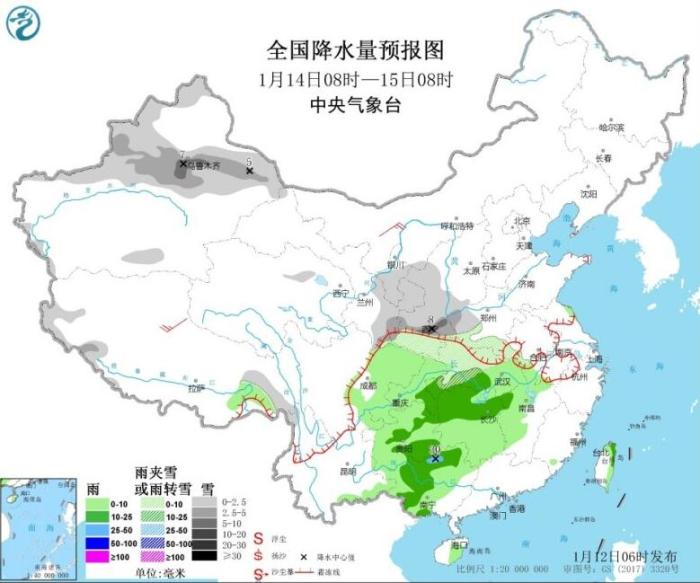 1月14日08時(shí)至15日08時(shí),新疆北部和沿天山地區(qū)、西北地區(qū)東部、黃淮西部、江漢中北部等地部分地區(qū)有小到中雪或雨夾雪,其中,新疆沿天山地區(qū)、陜西中部等地部分地區(qū)有大雪(5~8毫米)。江漢東部、江南北部和西部、西南地區(qū)東部、廣西大部等地部分地區(qū)有小到中雨,其中,廣西北部等地部分地區(qū)有大雨(25~30毫米)。內(nèi)蒙古西部、西藏中部等地部分地區(qū)有4~6級風(fēng)(見圖4)。