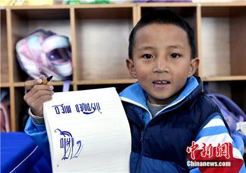 2023年3月,西藏拉薩市第一小學(xué)一年級(jí)六班學(xué)生吉美旺堆展示自己書寫的藏文。李林 攝