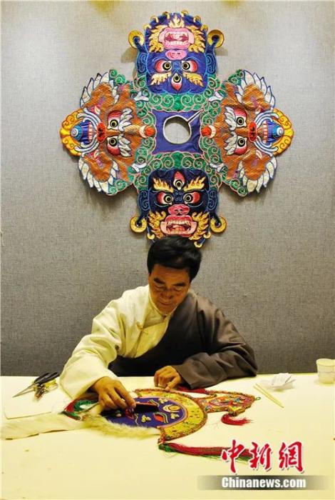 2015年10月,西藏非物質(zhì)文化遺產(chǎn)代表性傳承人加央益西在上海展示藏族面具的制作。周東潮 攝