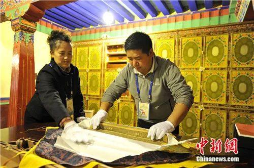 2012年9月,布達(dá)拉宮管理處文物保護(hù)科科長(zhǎng)卓嘎(左)與布達(dá)拉宮文物保護(hù)人員洛桑共同打開(kāi)貝葉經(jīng)。李林 攝