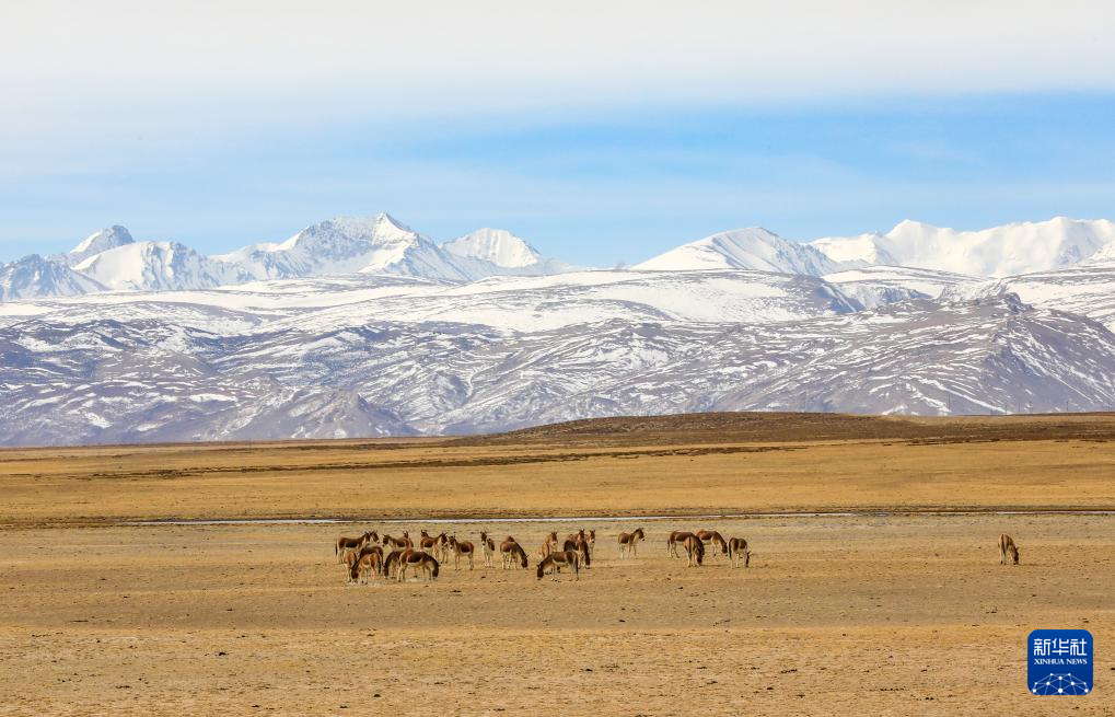 3月29日,藏野驢在西藏阿里地區(qū)普蘭縣境內納木那尼峰下覓食。新華社發(fā)(劉曉東攝)