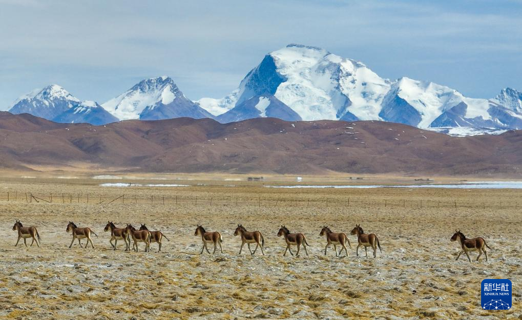 3月29日,藏野驢在西藏阿里地區(qū)普蘭縣境內雪山下奔跑(無人機照片)。新華社發(fā)(劉曉東攝)