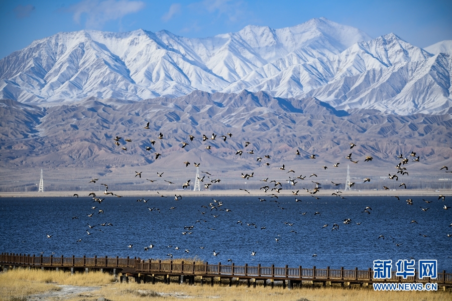天光云影,百鳥翔集,一群赤麻鴨在都蘭湖國(guó)家濕地公園上空飛翔。(11月21日攝)新華網(wǎng) 潘彬彬攝