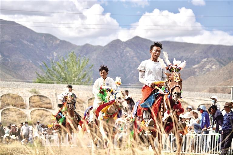 當日上午11時,茶巴朗村望果節(jié)賽馬正式開始,騎手們身著傳統(tǒng)服飾,戴著紅纓帽,身背彎弓,騎著打扮華麗的駿馬,進行了4000米速度賽馬、拾哈達、射箭、馬術等精彩比賽?,F(xiàn)場,觀眾揮舞手臂為選手們鼓勁吶喊。馳騁在賽場上,選手的吆喝聲伴著觀眾的吶喊聲在賽場上空匯聚。
