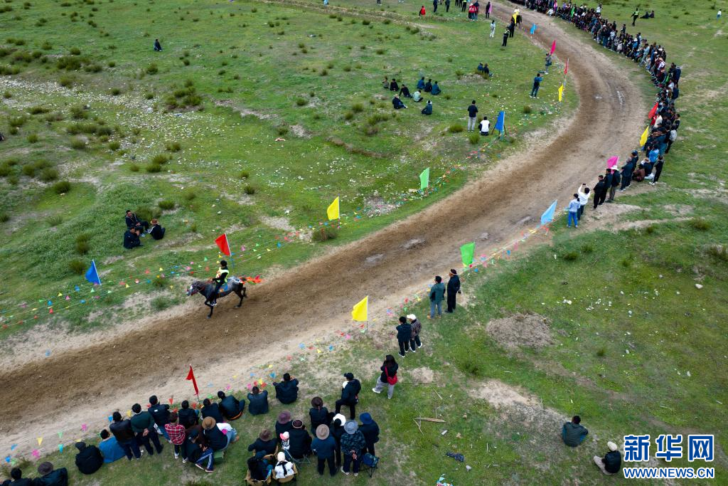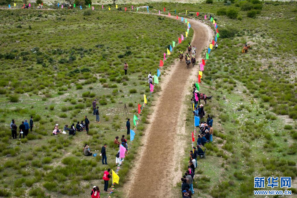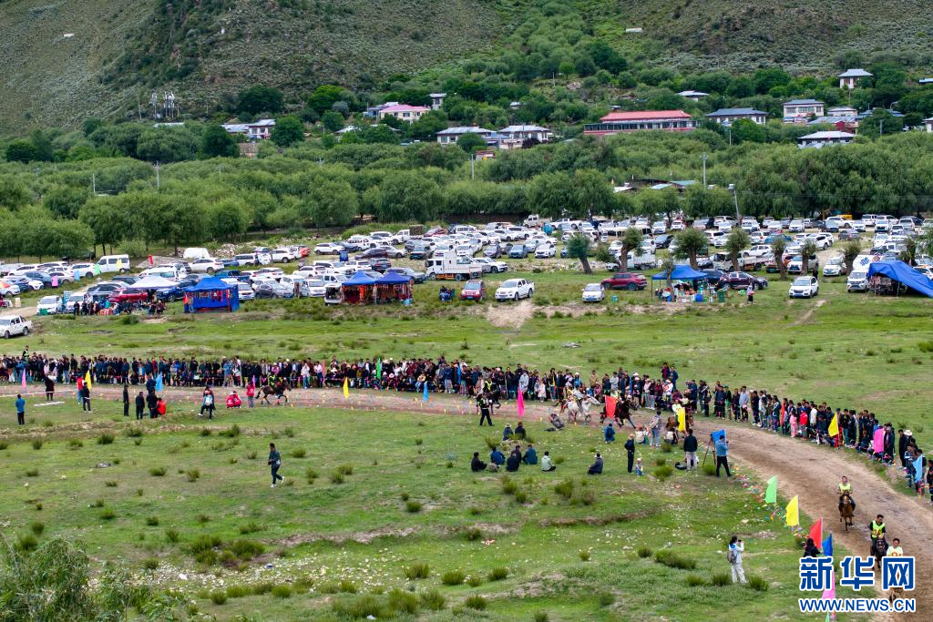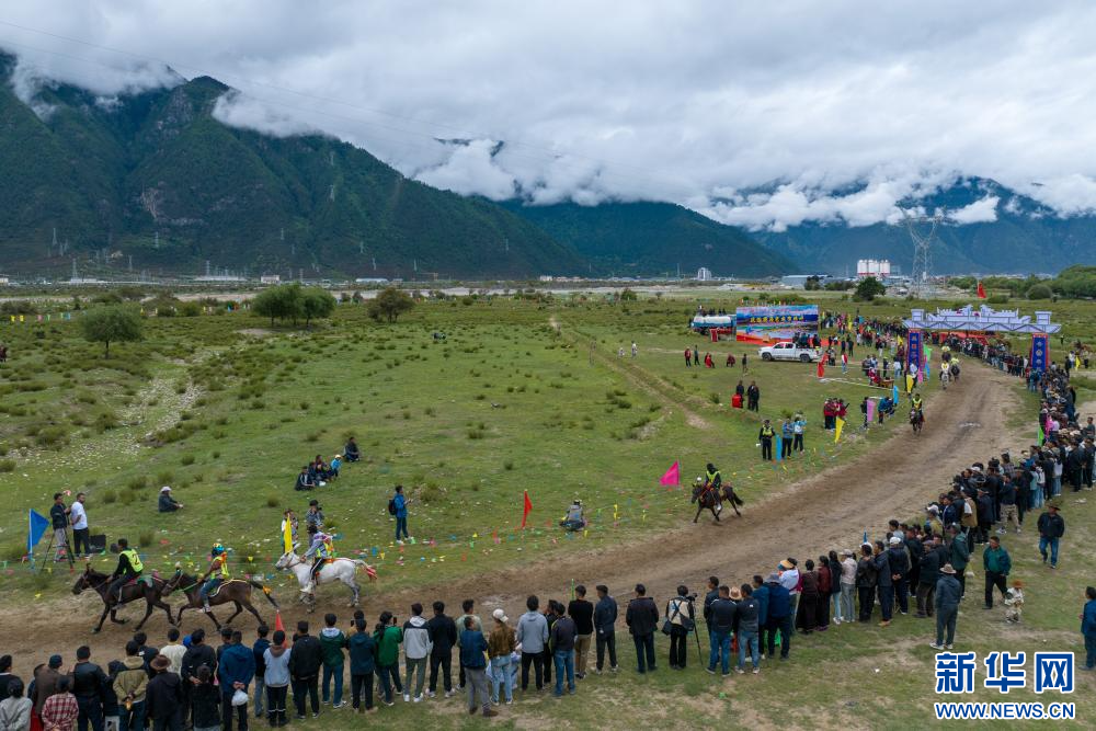 西藏林芝市林芝鎮(zhèn)第七屆尼洋旅游文化之民俗賽馬藝術(shù)節(jié)活動(dòng)現(xiàn)場(chǎng)(7月22日攝,無(wú)人機(jī)照片)。新華網(wǎng) 旦增努布 攝