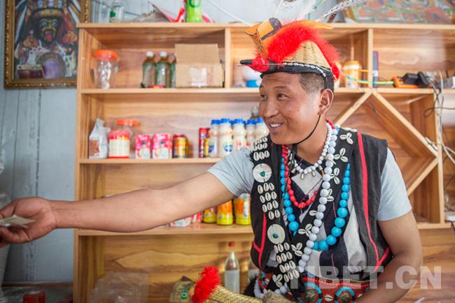 對于扎西頓珠來說,兒子的成長是他關(guān)心和欣慰的。另一件扎西頓珠關(guān)心的事是他的小生意盈利如何。扎西頓珠不僅是名舞者,還是一個家庭旅館、商店、飯店的老板。2014年斗玉珞巴民族鄉(xiāng)投入大量資金改善交通、水利、通信等基礎(chǔ)設(shè)施,建設(shè)了斗玉珞巴民族鄉(xiāng)生態(tài)文明小康示范村。扎西頓珠家分到了一幢250多平米的二層小樓。家里只有四口人,扎西頓珠覺得房子空著有些浪費,就開起了家庭旅館?,F(xiàn)在家庭旅館里住進(jìn)了一些修路工人。來自四川邛崍的張先生住在扎西頓珠家一樓,雖語言不通,但剛搬進(jìn)來兩個月的他和工友們早已同扎西頓珠熟絡(luò)起來。