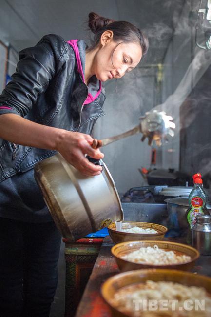 圖為扎西頓珠的妻子在廚房為客人煮面條