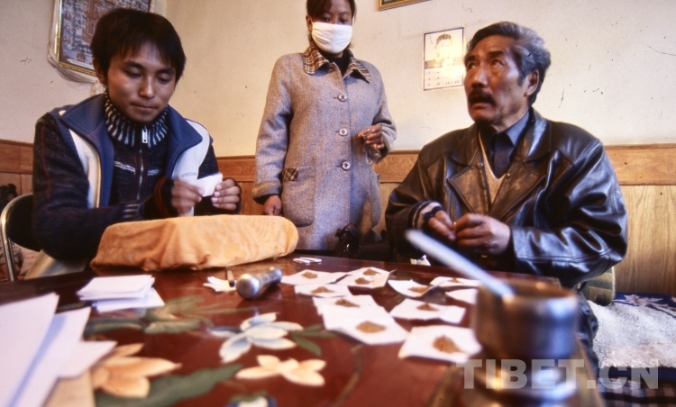 第二天早上9點(diǎn),我來(lái)到了市婦幼保健院附近他的診所,長(zhǎng)長(zhǎng)的隊(duì)伍一直從小屋排到了外面幾十米,從病人的穿著看,有拉薩本地人,也有許多外地人,還有不少是遠(yuǎn)道而來(lái)的牧民。我想給旦增醫(yī)生拍些工作照,于是直接進(jìn)了診所。這個(gè)診所是一個(gè)很小很簡(jiǎn)單的套間,旦增醫(yī)生在外面診病,他的兩個(gè)徒弟在里面配藥。多年來(lái),他堅(jiān)持義診,只收取一點(diǎn)制藥的成本錢。